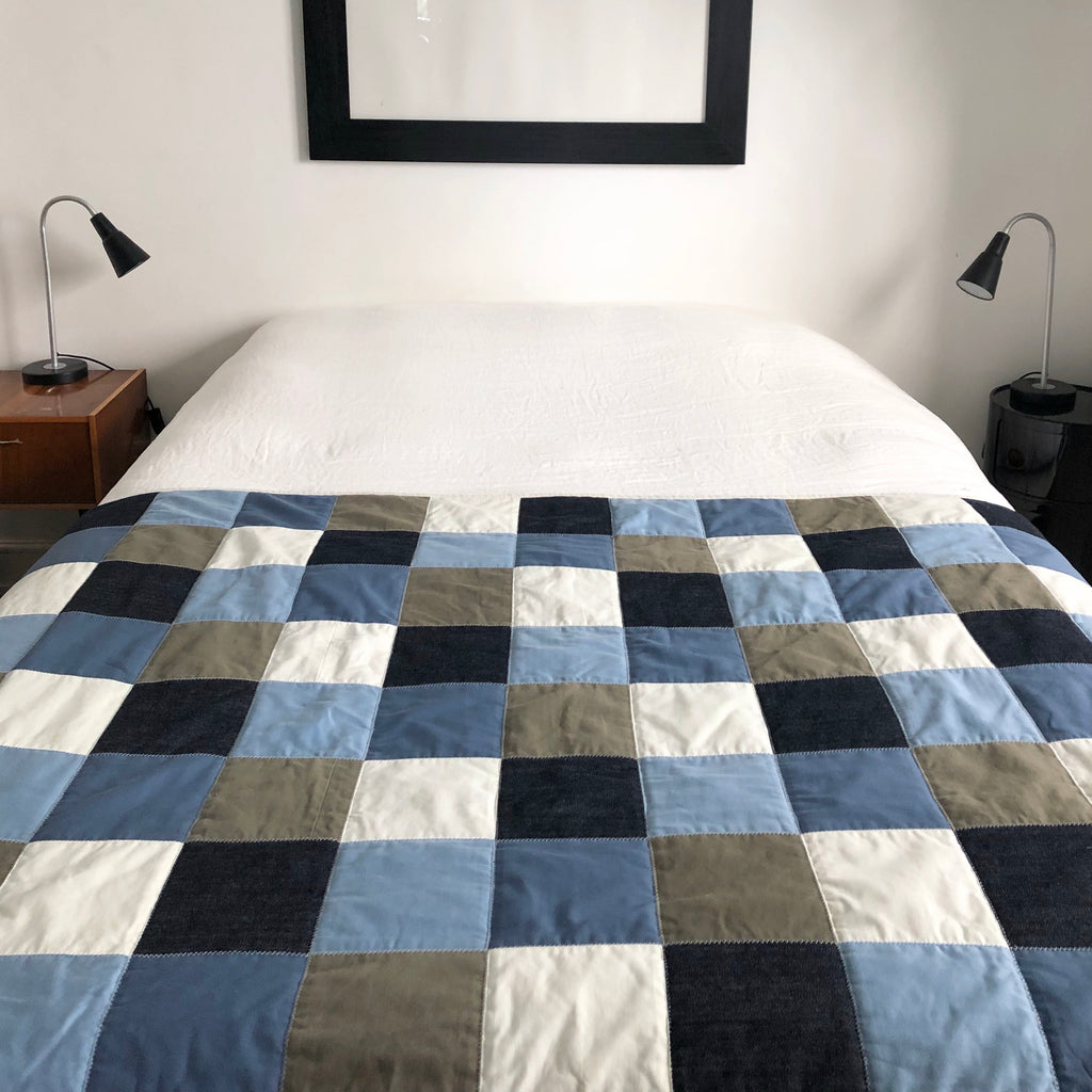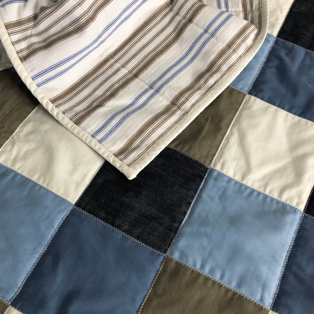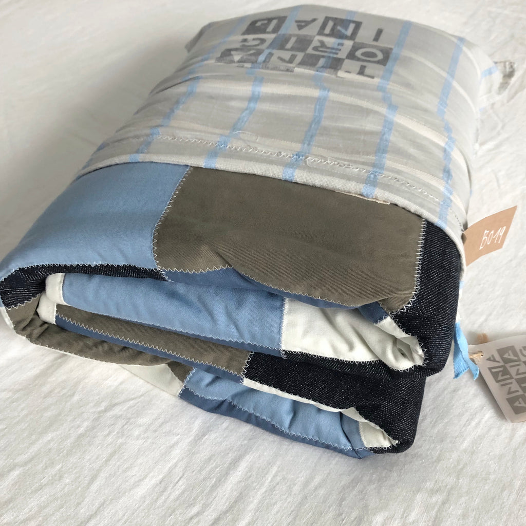 the blocks are a mix of cotton rich materials, the back is a cotton cloth and inside is a batting for comfort and warmth